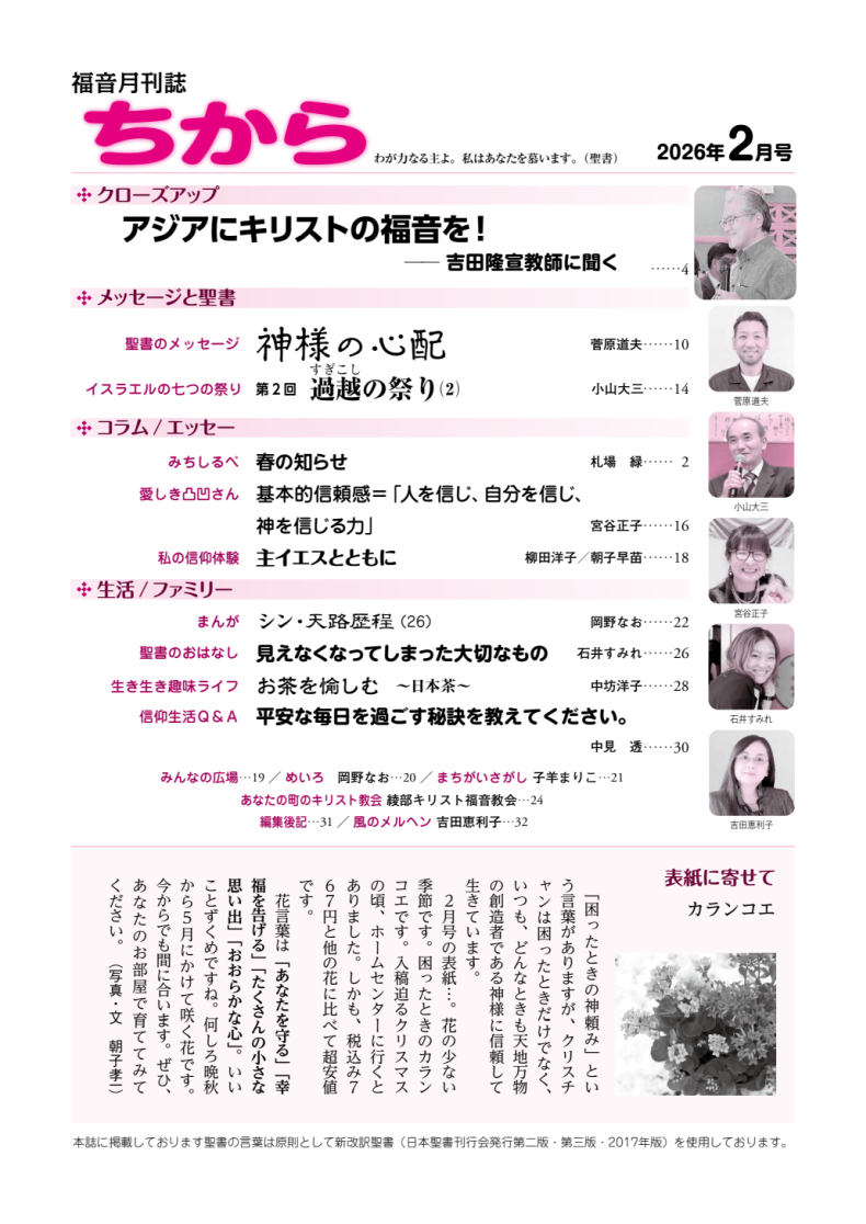 雑誌「ちから」は、超教派の福音月刊誌で、TPKF(単立ペンテコステ教会フェローシップ)が発行する、営利を目的としないものです。